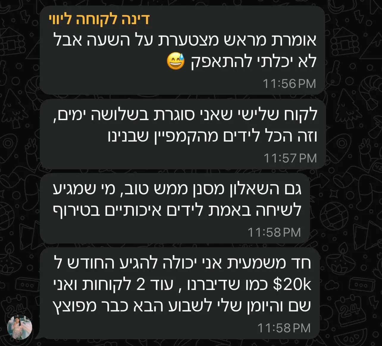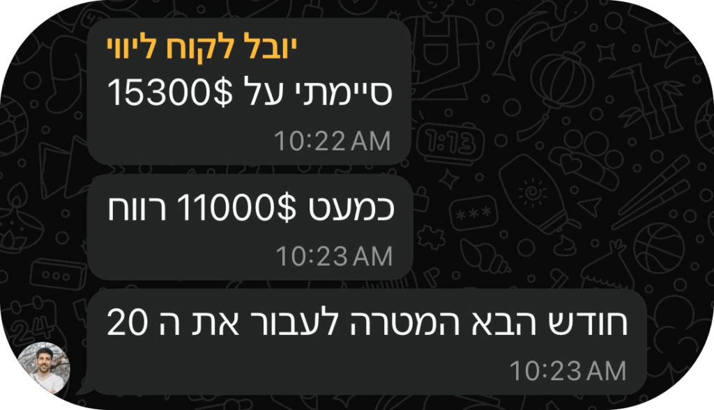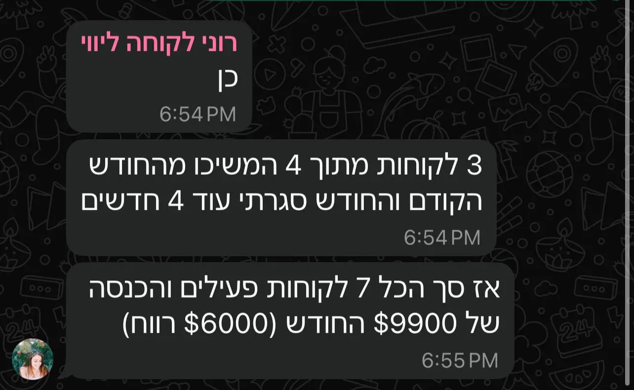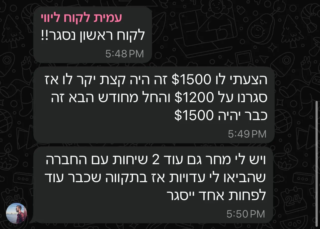 כשקובי הגיע אלינו לתכנית, היו לו את כל הסיבות ״למה לא״. חוסר ידע בשיווק. חוסר ניסיון בעסקים. אנגלית לא משהו. באמצע תואר תובעני. באמצע צו 8 עם יותר מ 700 ימי מילואים מאז השביעי באוקטובר. ואם כל זה לא מספיק… הוא גם מגמגם. אבל במקום להתמקד בסיבות למה לא, קובי בחר להתמקד בסיבות למה כן. קובי הגיע נחוש. לבנות עסק אמיתי. עסק עם לקוחות שמשלמים יותר ומתלוננים פחות. עסק שמייצר לו חופש אמיתי ולא כאבי ראש. עסק שעובד בשבילו.. ולא ההפך. אז התחלנו את התכנית... והשאר היסטוריה. תוך פחות מחצי שנה, קובי בנה סוכנות של 40 אלף שקל בחודש. היעד הבא? 6 ספרות בחודש.