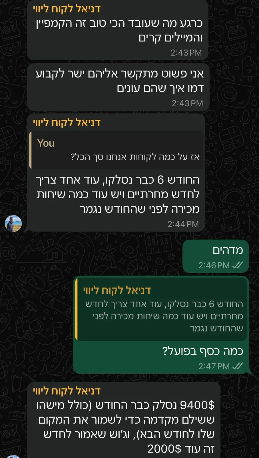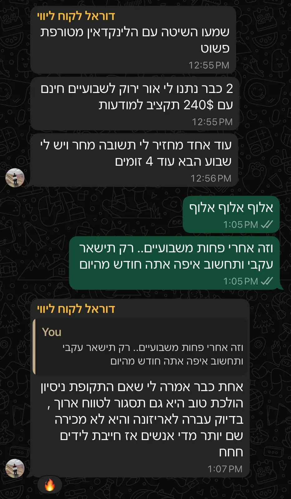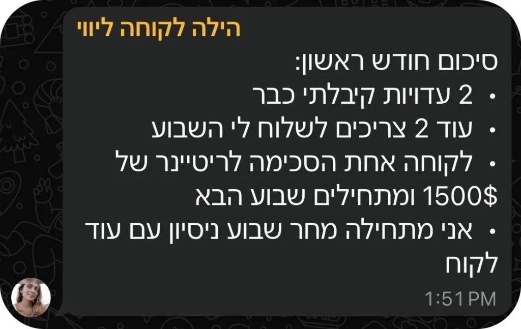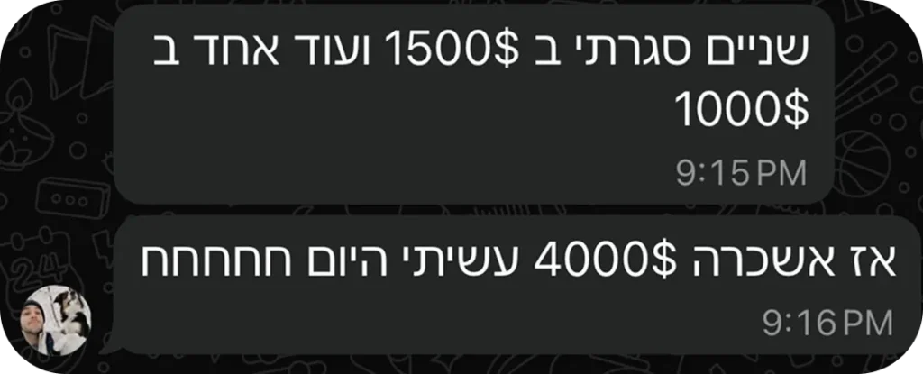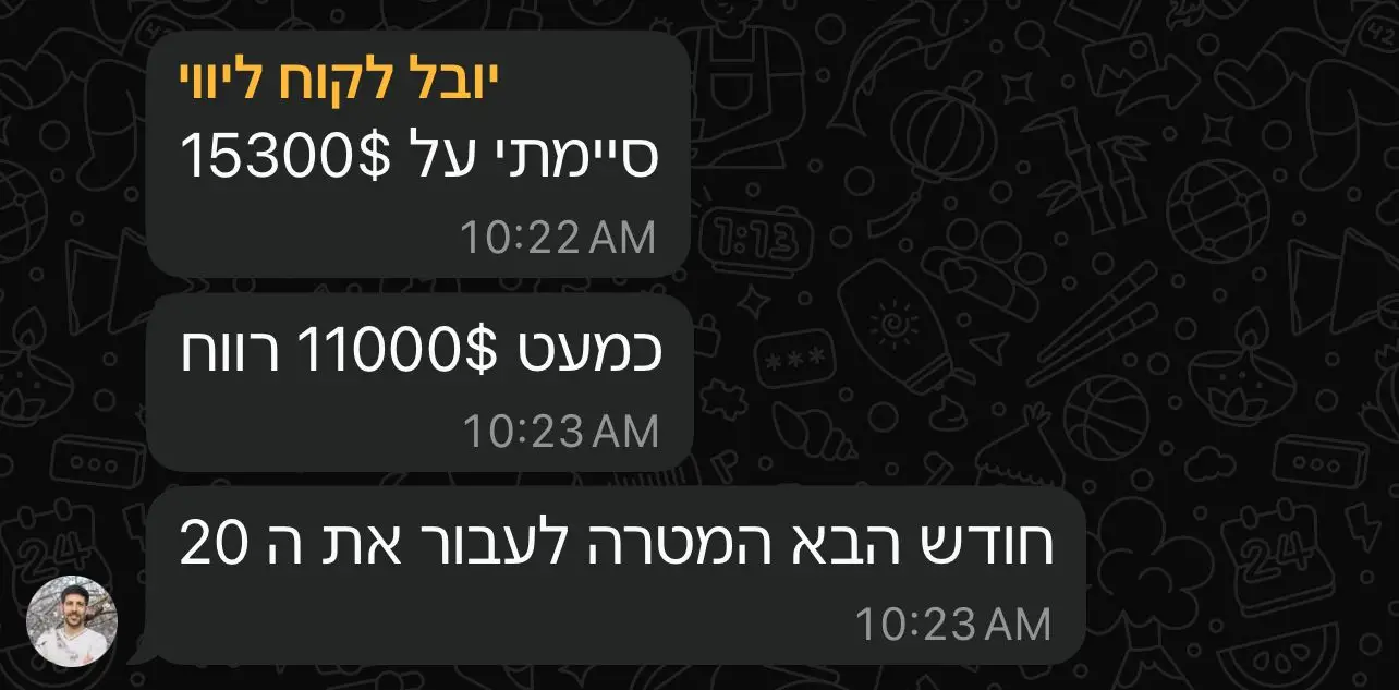 כשקובי הגיע אלינו לתכנית, היו לו את כל הסיבות ״למה לא״. חוסר ידע בשיווק. חוסר ניסיון בעסקים. אנגלית לא משהו. באמצע תואר תובעני. באמצע צו 8 עם יותר מ 700 ימי מילואים מאז השביעי באוקטובר. ואם כל זה לא מספיק… הוא גם מגמגם. אבל במקום להתמקד בסיבות למה לא, קובי בחר להתמקד בסיבות למה כן. קובי הגיע נחוש. לבנות עסק אמיתי. עסק עם לקוחות שמשלמים יותר ומתלוננים פחות. עסק שמייצר לו חופש אמיתי ולא כאבי ראש. עסק שעובד בשבילו.. ולא ההפך. אז התחלנו את התכנית... והשאר היסטוריה. תוך פחות מחצי שנה, קובי בנה סוכנות של 40 אלף שקל בחודש. היעד הבא? 6 ספרות בחודש.