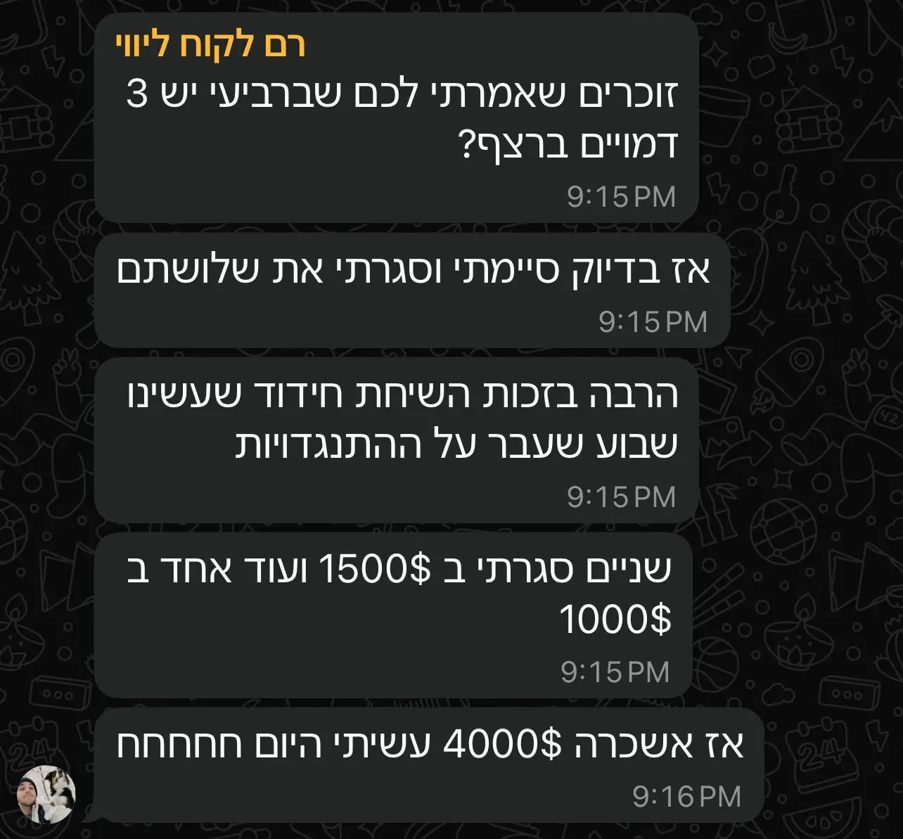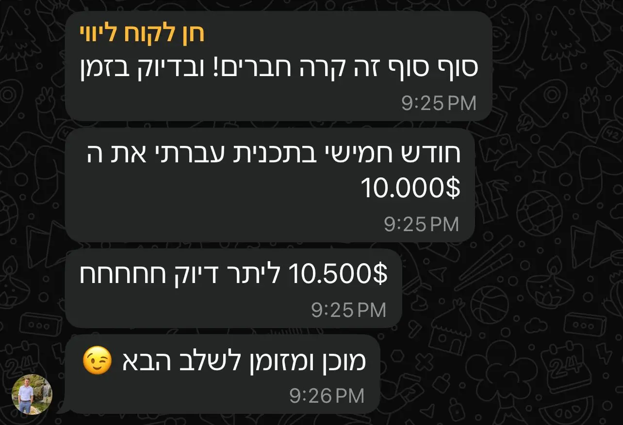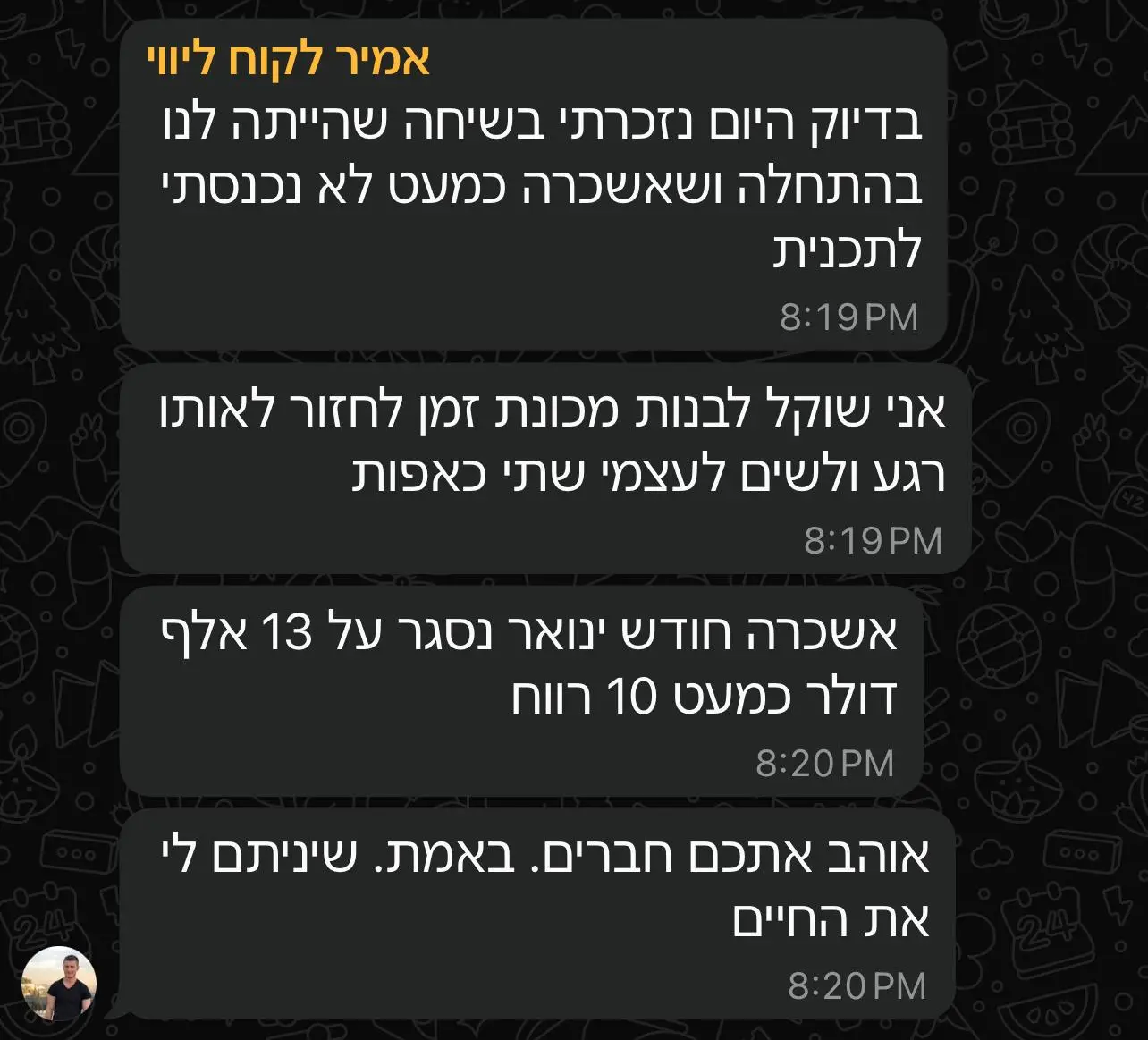 במשך שנים לירם היה ״חלק מהמטריקס״ - עשה תואר במדעי המחשב, אפילו מצא אחלה עבודה בהייטק. על פניו שיחק אותה. אבל לו זה לא הרגיש ככה. הוא רצה יותר. הוא רצה לחיות את החיים בתנאים שלו. אז הוא שמע קצת על עולם האונליין, חקר, למד, קנה כמה קורסים ותכניות ליווי - אבל שום דבר לא באמת הלך לו. רגע לפני שהוא התייאש סופית, קפצנו ללירם באינסטגרם באיזה מודעה ממומנת, והוא החליט להשאיר פרטים ולשמוע מה אנחנו עושים. והשאר? היסטוריה.